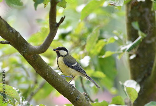 © Pavol Klimek, Obraz premium Great Tit with sunflower in beak sitting on a branch in the garden