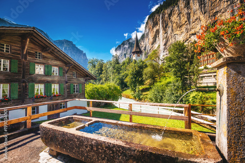 Naklejka premium Great view of alpine village. Location place Swiss alps, Lauterbrunnen...