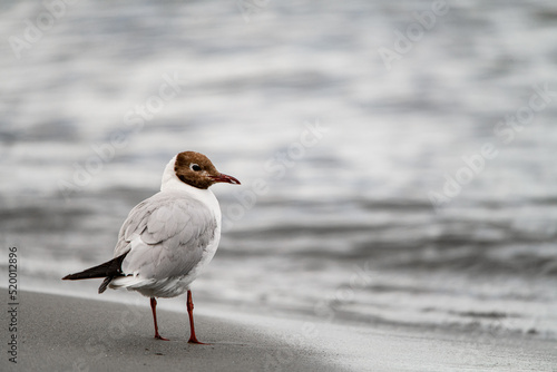 © fesenko, Obraz premium Great view of young black-headed gull standing on sandy coast at water