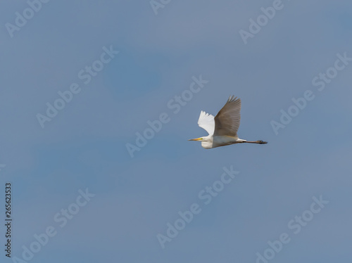 Fototapeta premium Great White Egret Flying in a Clear Blue Sky in Latvia in Spring