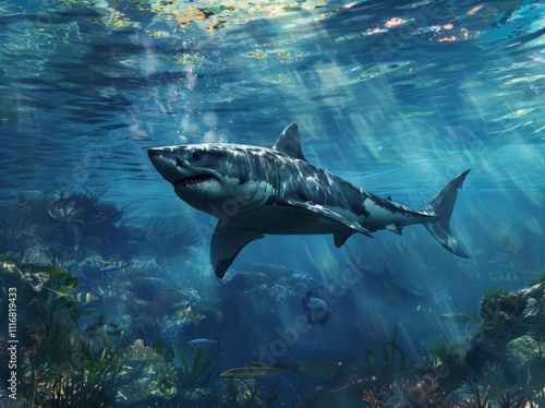 © Deris Firmansyah, Fototapeta premium Great white shark and sun rays