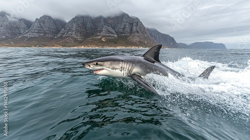 Fototapeta premium Great white shark breaches the water's surface, showcasing powerful physique against a backdrop of dramatic mountains