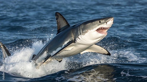 © Abdul, Fototapeta premium Great white shark breaking through the ocean surface its powerful body mid leap ultra sharp details