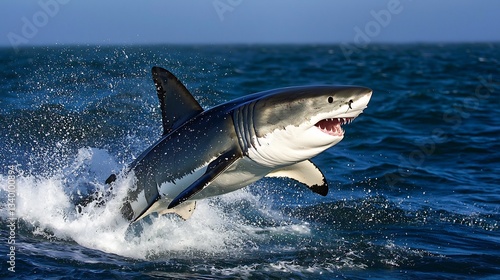 Fototapeta premium Great white shark breaking through the ocean surface its powerful body mid leap ultra sharp details