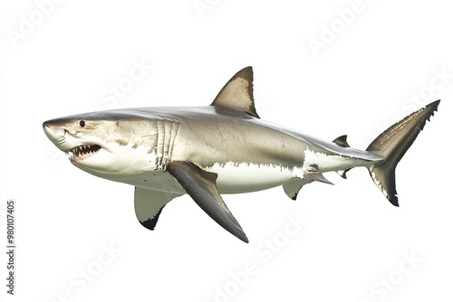 © Dzikrul Husnani, Fototapeta premium great white shark - Carcharodon carcharias - full view while swimming, face and teeth visible isolated on white background all fins and gills showing, ai