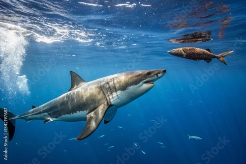 © AffiqAG, Fototapeta premium Great White Shark Circles Seal in Deep Blue Ocean - Underwater Action Photography