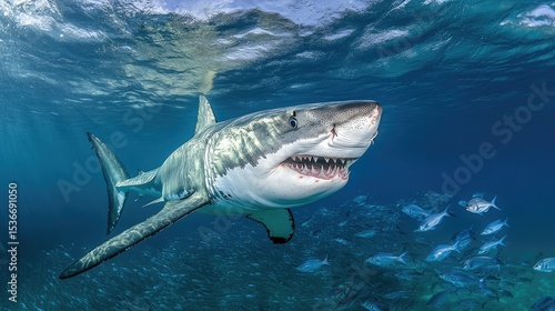 Fototapeta premium Great white shark emerging from the deep, jaws wide, approaching a school of fish in clear ocean waters