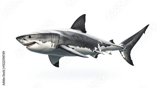 © Thanthara, Fototapeta premium Great white shark emerging on white background