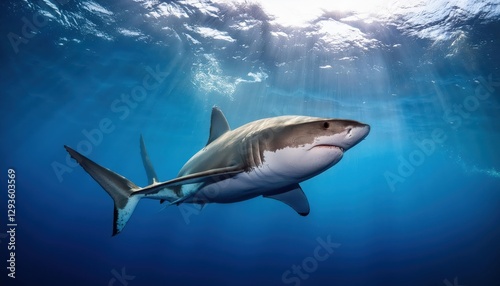 Fototapeta premium Great White Shark Gliding Through CrystalClear Underwater Depths at Twilight,...