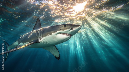 © Abdul, Fototapeta premium Great white shark gliding through the deep ocean illuminated by sun rays filtering through the water hyper realistic 3D render