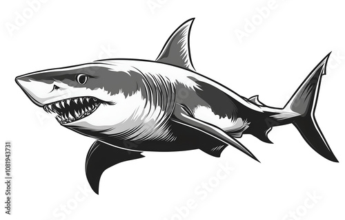 © Anuson, Fototapeta premium great white shark in black and white ink on white background
