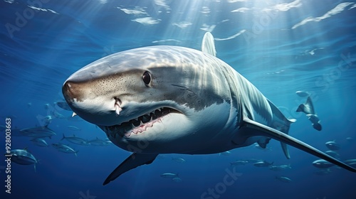 © sk, Fototapeta premium Great White Shark in blue ocean. Underwater photography.