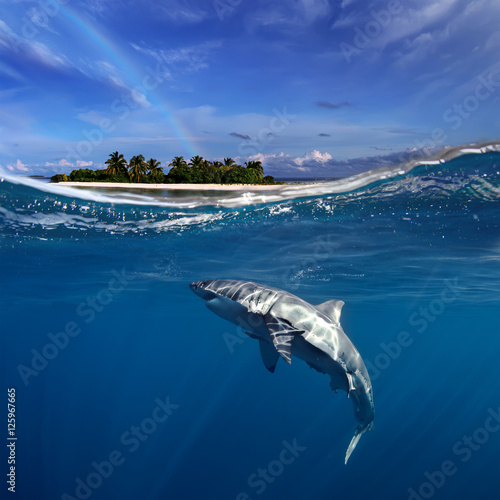 © willyam, Obraz premium Great White Shark in blue ocean. Underwater photography. Predator hunting near water surface.