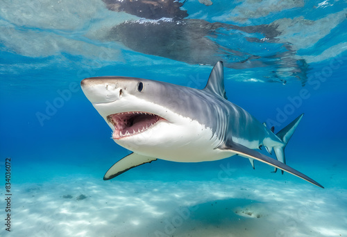 © anetlanda, Fototapeta premium Great white shark in deep blue water.