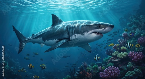Fototapeta premium Great White Shark in Deep Ocean: A majestic great white shark glides through the deep ocean, surrounded by vibrant coral reefs and the ethereal play of sunlight.