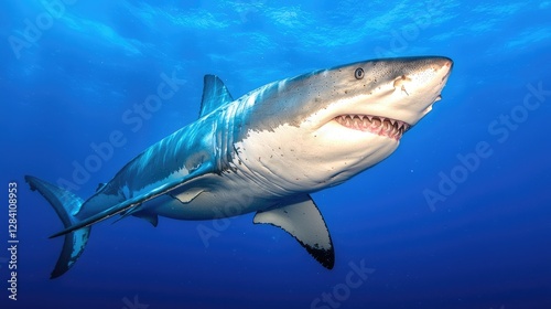 Fototapeta premium Great white shark in the deep blue ocean, powerful predator, marine wildlife,...