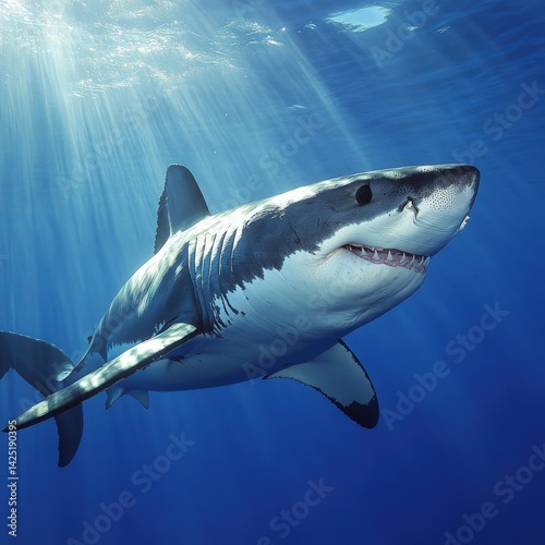 Naklejka premium Great white shark in the deep blue ocean. Sunlight beams through the water