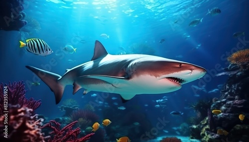 Obraz premium Great white shark in the ocean, portrait of White shark hunting prey in the...