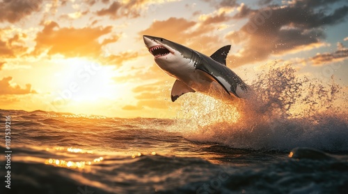 Fototapeta premium Great white shark leaping from ocean waves at sunset.