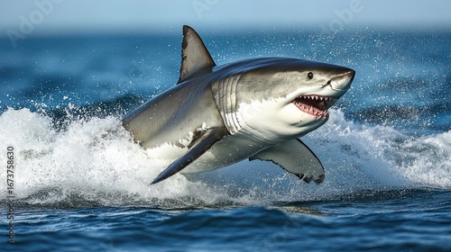 Fototapeta premium Great white shark leaping, ocean waves, wildlife documentary