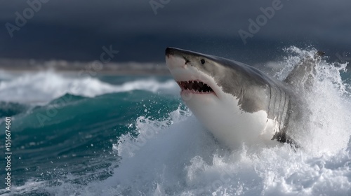 © curvasud, Fototapeta premium Great white shark leaping out of the ocean (1)