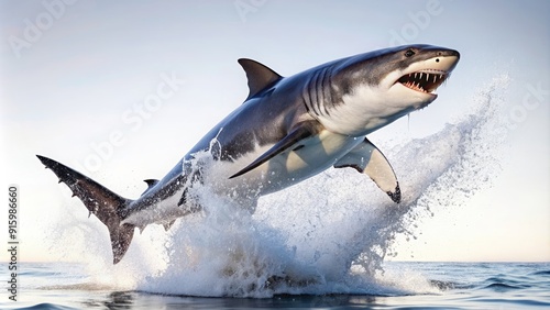 Fototapeta premium Great White Shark leaping out of water isolated on white background , Shark, Great White, Ocean, Predator, Splash, Jump, Wildlife