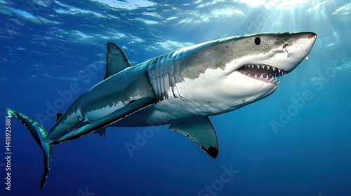 Fototapeta premium Great White Shark, Ocean Depth, Sunlight, Predatory Prowl