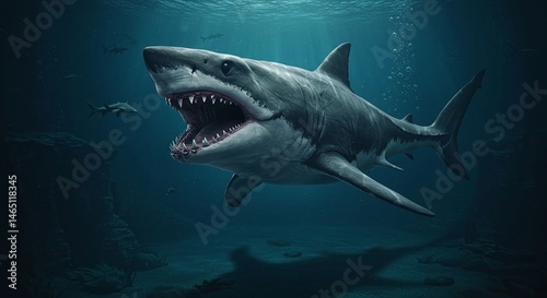 Fototapeta premium Great White Shark Open Mouth Underwater Predator with Sunlight Rays