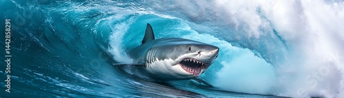 © Asrianto, Fototapeta premium Great white shark riding ocean wave