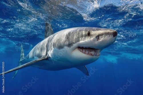 Naklejka premium Great white shark smiling and swimming gracefully in clear blue ocean waters...