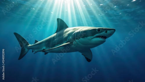 Fototapeta premium Great white shark, sunbeams pierce deep blue water, apex predator, marine,...