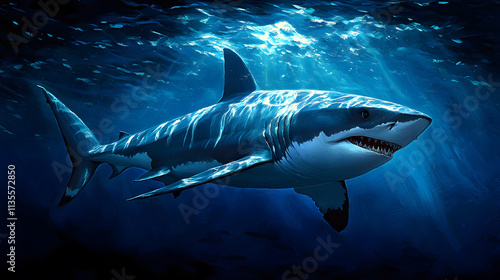 Fototapeta premium Great white shark swimming deep underwater in the ocean marine life blue environment