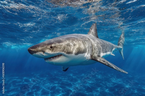 Fototapeta premium Great white shark swimming gracefully in the clear, blue ocean water during...
