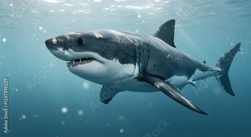 Fototapeta premium Great White Shark Swimming Gracefully Underwater in the Ocean Light