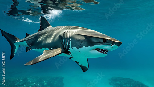 Obraz premium Great White Shark Swimming in Clear Blue Ocean Water Underwater Marine...