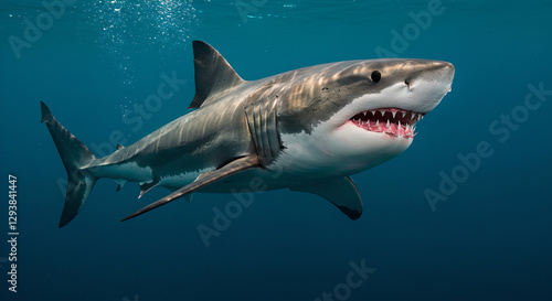 Fototapeta premium Great white shark swimming in deep blue ocean water. Dangerous marine predator showing teeth. Powerful sea creature in natural habitat. Wildlife underwater scene for education and nature