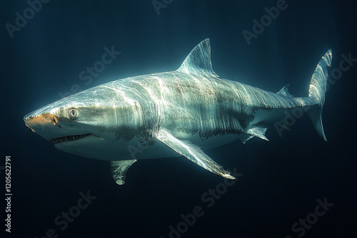 © Johanddss, Fototapeta premium Great White Shark Swimming In Deep Ocean Water