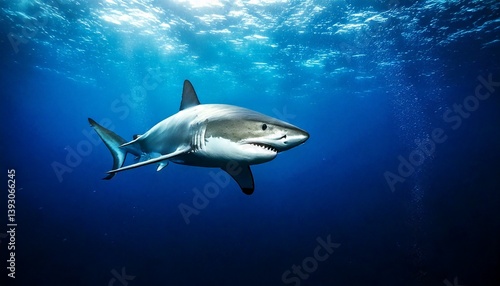 Fototapeta premium Great white shark swimming in deep sea, dramatic underwater lighting, dark blue gradient background