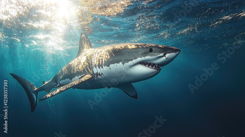Fototapeta premium Great White Shark Swimming in Sunlight Ocean Depths