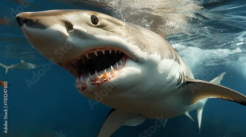 © Panyamethi, Fototapeta premium Great White Shark Swimming in the Deep Blue Caribbean Waters