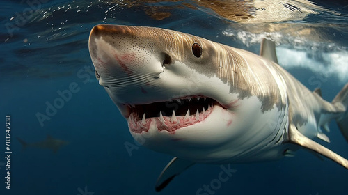 © Panyamethi, Naklejka premium Great White Shark Swimming in the Deep Blue Caribbean Waters