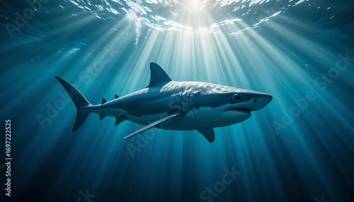 Fototapeta premium Great white shark swimming in the deep blue ocean illuminated by sun rays...