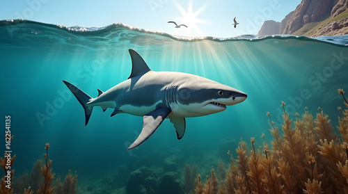Obraz premium Great white shark swimming in the ocean, view from underwater. Sunlight and marine life.
