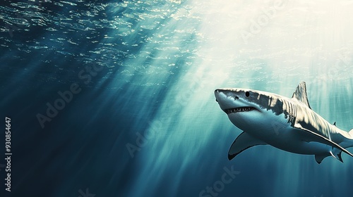 Fototapeta premium Great White Shark Swimming in the Ocean with Sunlight