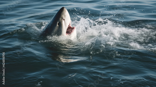 © Markus, Fototapeta premium Great white shark swimming in the ocean with wide open mouth. Generative AI.