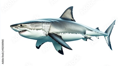 © 69, Fototapeta premium Great white shark swimming, isolated on a pure white background, highlighting its strong features and sleek form