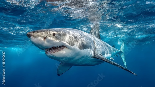 Naklejka premium Great white shark swimming just below surface with visible teeth in clear,...