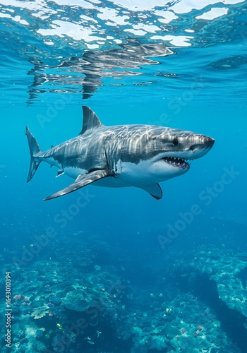 © rafliand, Fototapeta premium Great White Shark Swimming Underwater in Clear Blue Ocean Water