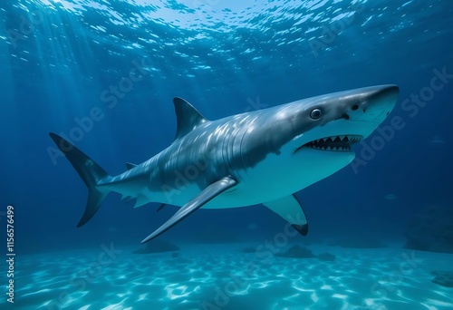 Fototapeta premium Great white shark swimming underwater in ocean depths