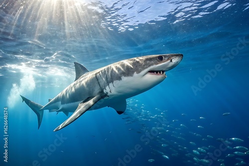 Fototapeta premium Great white shark swimming underwater in ocean with sunlight shining through